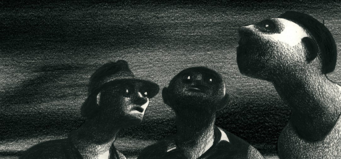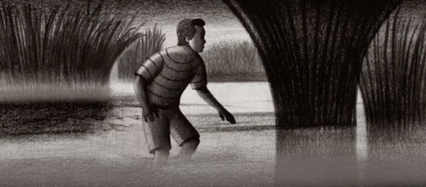 This week, we have a special DOUBLE winner. The fifth and final segment gives both cozy and spooky in equal supply. Animated in a simpler, cleaner style than the rest of the film’s installments, this story, written, designed and directed by famed New Yorker cartoonist, Richard McGuire, capitalizes on its stark whites and inky blacks.