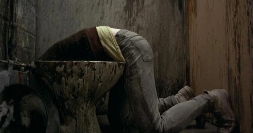 Since when did “bodily waste” become a foregone inevitability in a haunted house? Ghosts famously have no bowels. Zombies lack the frontal lobe to use a toilet. Cannibals eat people, but surely they flush. There’s almost no horror trope I can think of that would logically result in a bathroom being thoroughly demolished by deuce.