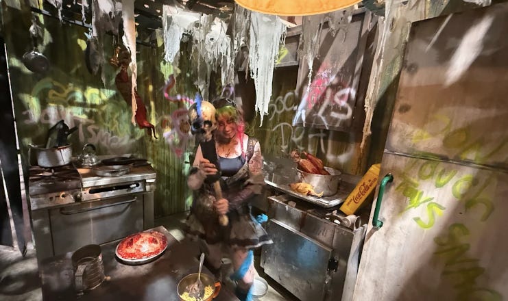 There is almost always a nightmare kitchen where you’ll find ghoulish food often with a wink: an octopus emerging from a stockpot. Various limbs in a fridge left ludicrously ajar. A chef presenting you a head on a platter.